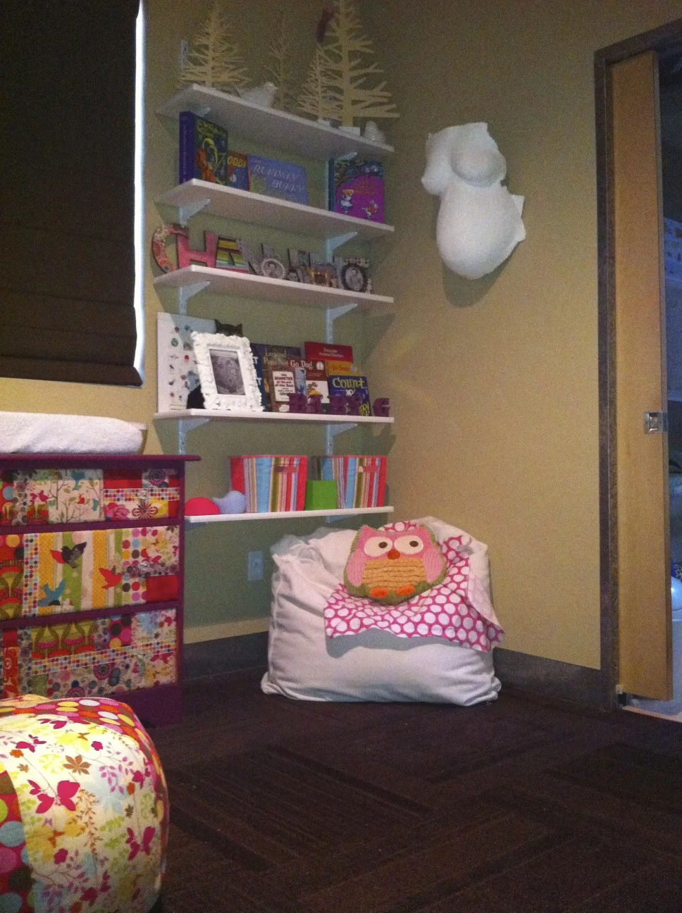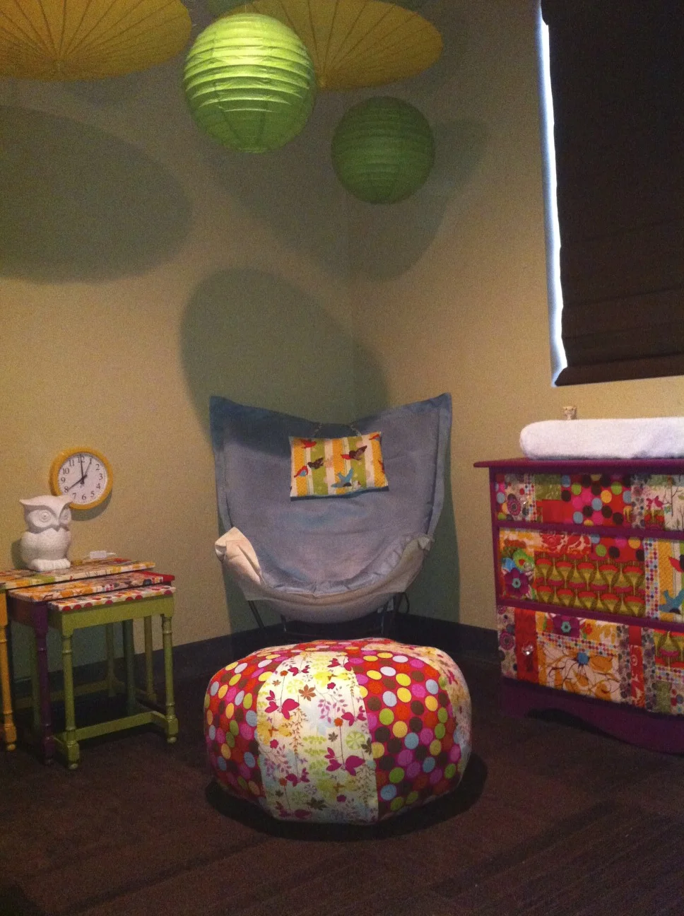 our rocking chair is comfy, like a big pillow. you kind of sink into it. it is a puff rocker, purchased from terra verde. the only challenge is it is armless so, a boppy is a must when nursing the bird. i bought the rocker on clearance because the ottoman wasn’t included with it. my mom makes these beautiful and fun floor poofs so, we again had fun with the fabrics and use it to rest our feet. the bird also LOVES climbing around on it.