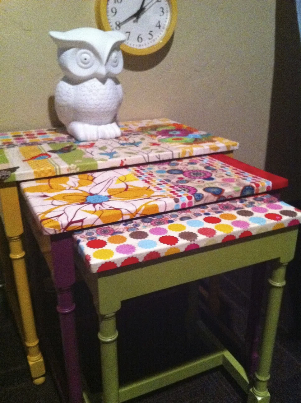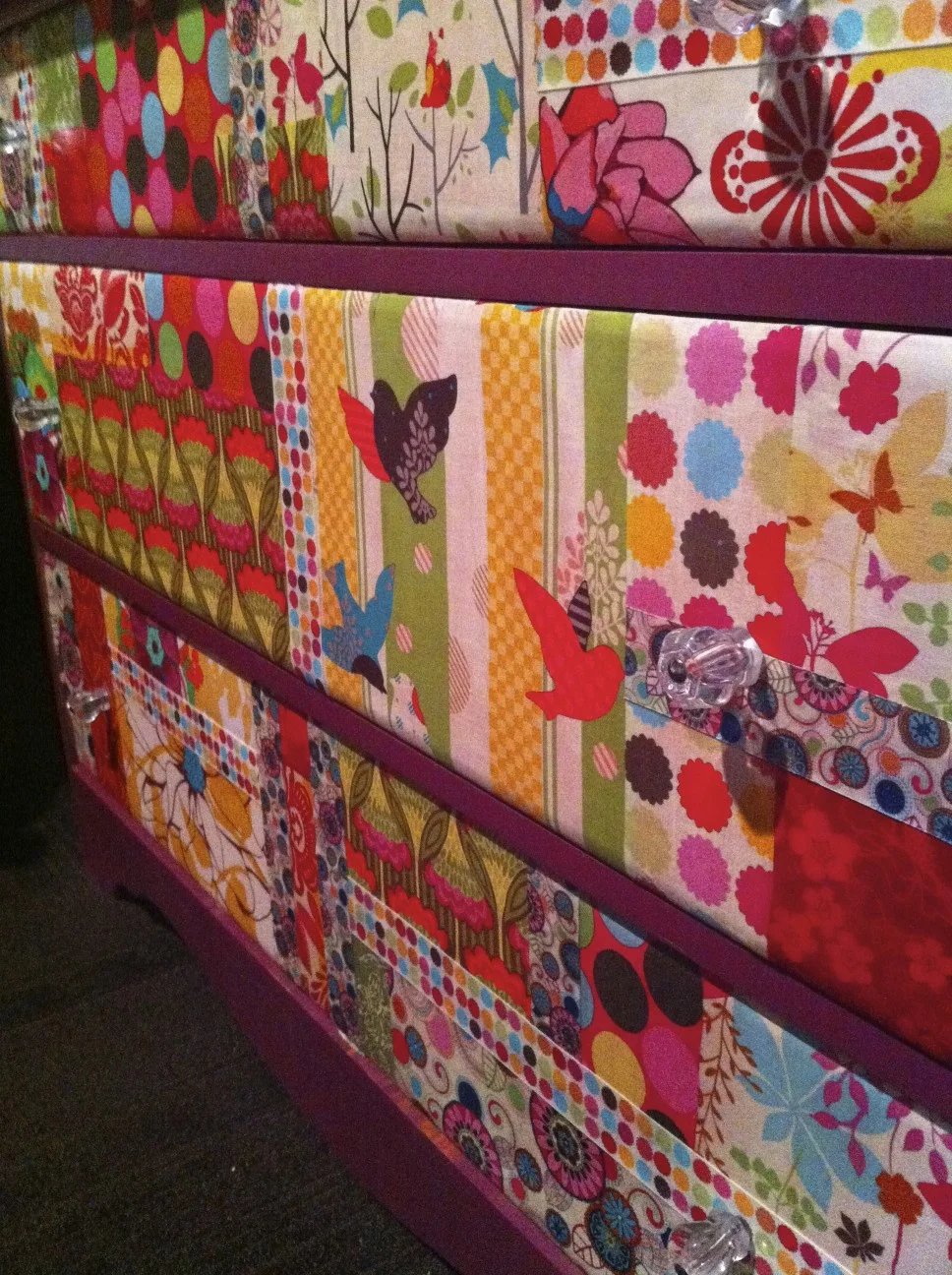 the side tables were created in the same way as the dresser. they were given to us by a friend. i painted the legs and fabric decoupaged the top surface.