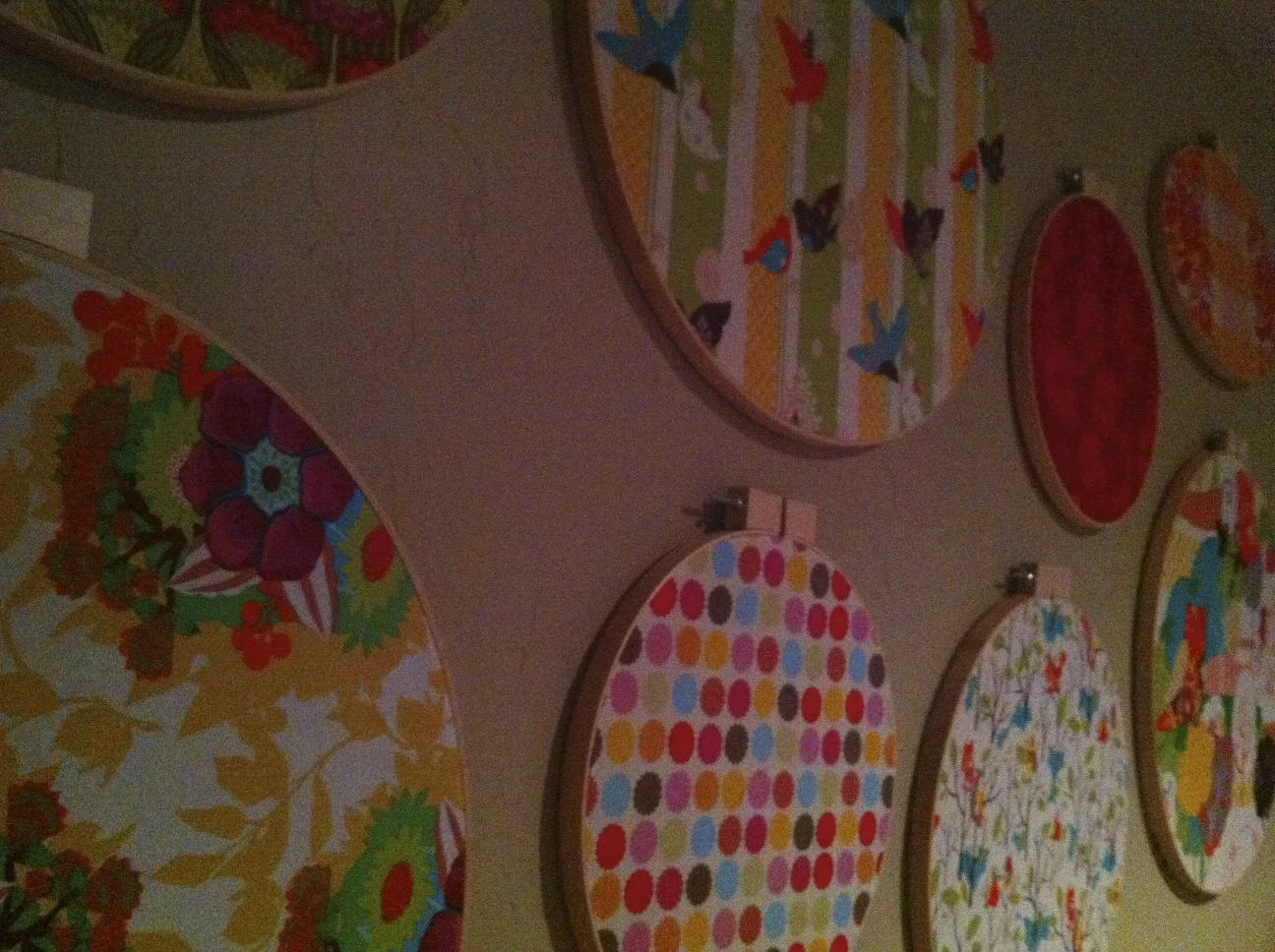 this was very simple to do. you can purchase quilting hoops, in many sizes, at most craft stores. cut your fabric slightly larger than the hoop and sandwich the fabric between the two pieces. tighten the screws and trim excess fabric from the back. this makes a cheap, easy and big impact design element. plus, the fabrics can easily be switched out at a later date.