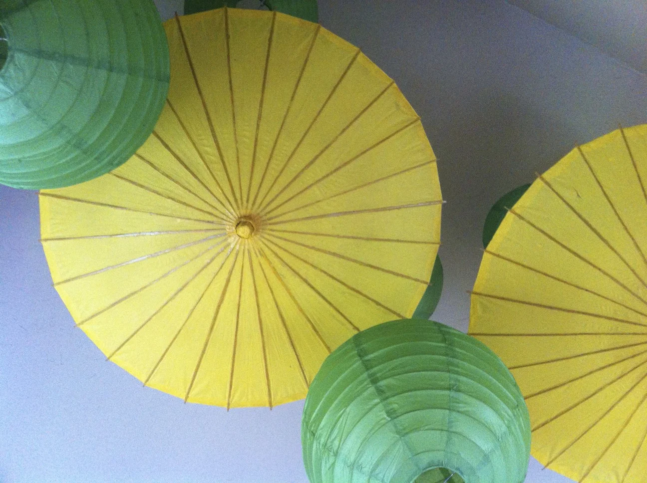 for a ceiling accent, i used fishing line to tie the yellow umbrellas and green paper lanterns to the ceiling. i made sure to knot the line really well on both the lanterns and umbrellas and then to a clear thumbtack, which then went into the ceiling.
